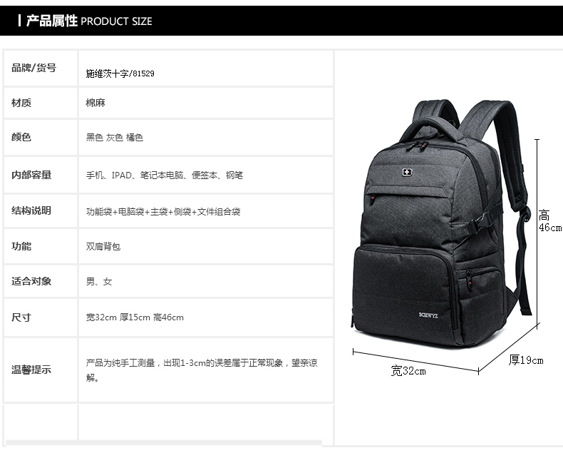 • 商品名称:施维茨十字双肩包男士背包高中学生书包女韩版休闲旅行包电脑包潮