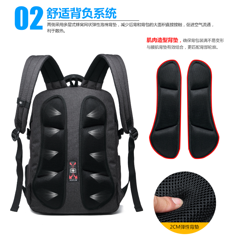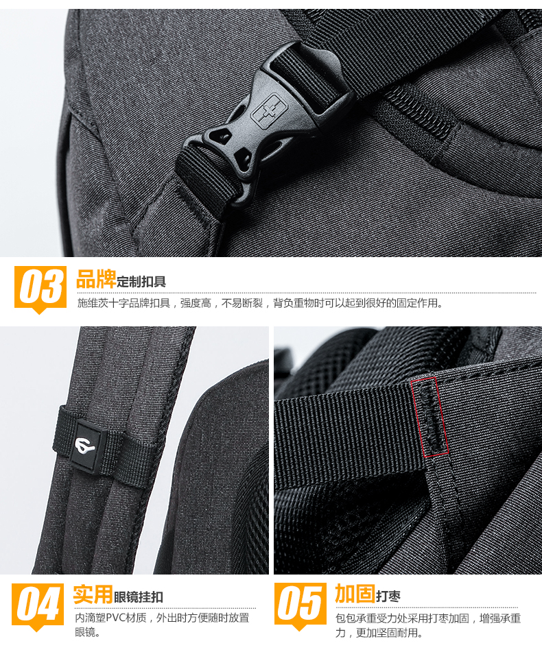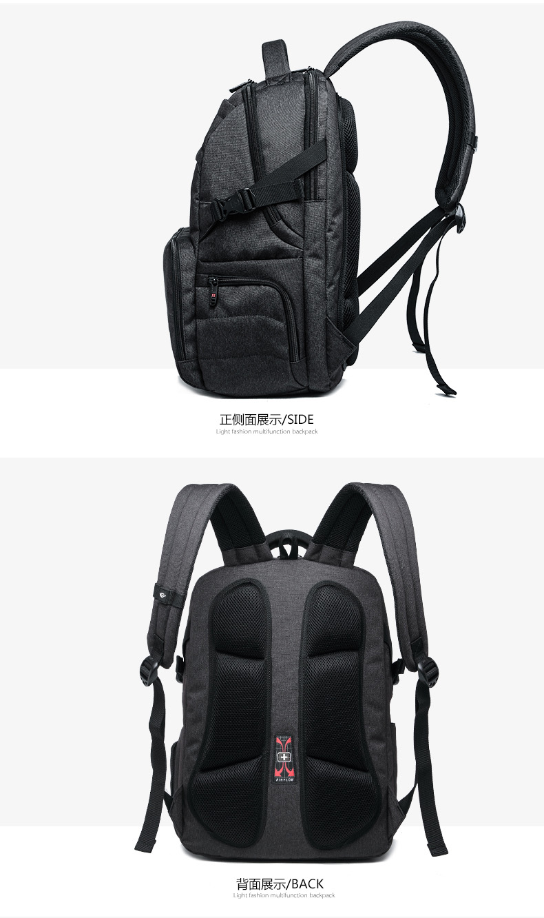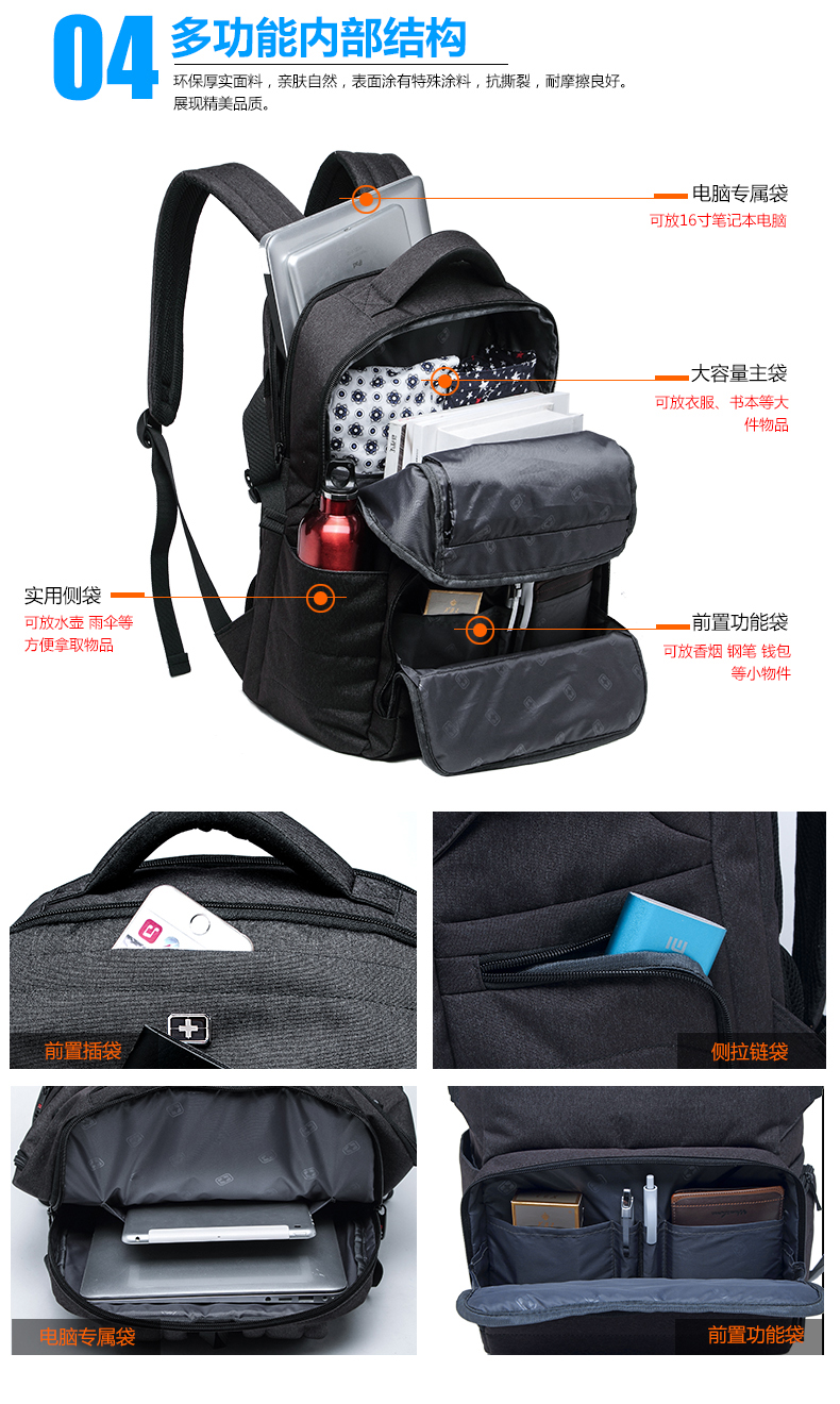 • 内部结构:网袋 拉链暗袋 手机袋 证件袋 夹层拉链袋 电脑插袋 相机插袋