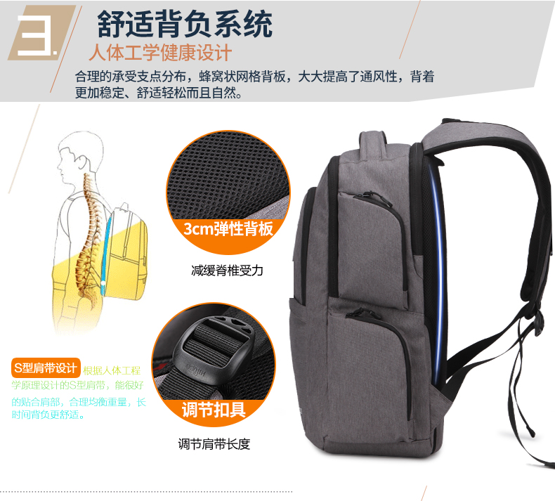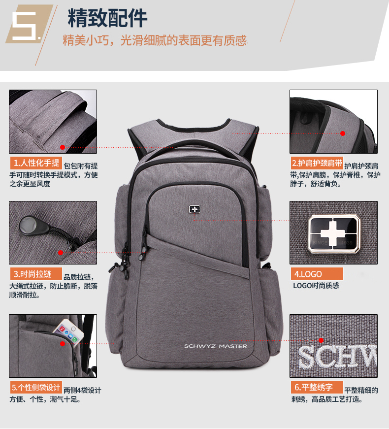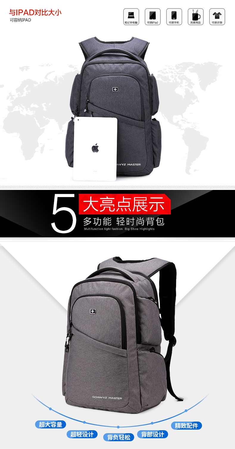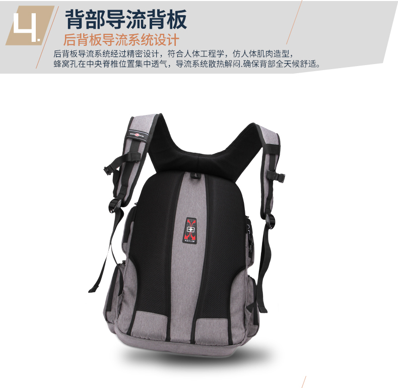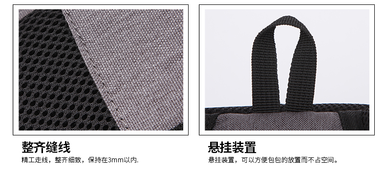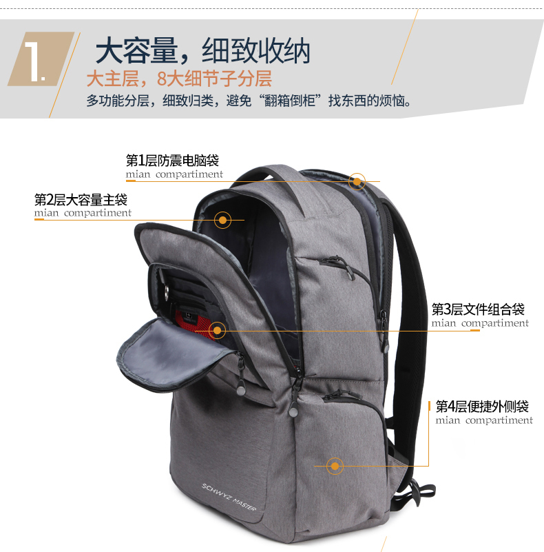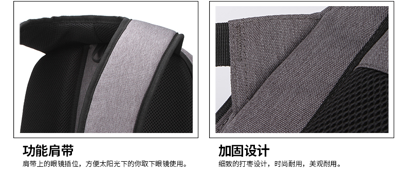 • 内部结构:网袋 拉链暗袋 手机袋 证件袋 夹层拉链袋 电脑插袋 相机插袋