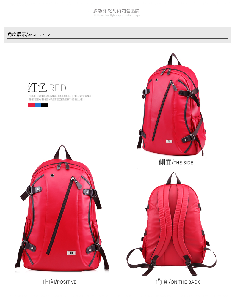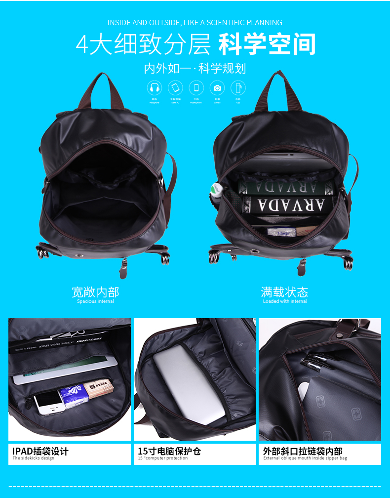 • 内部结构:拉链暗袋 手机袋 证件袋 夹层拉链袋 电脑插袋 相机插袋